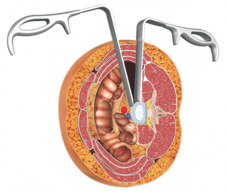 ②提倡直视下显露。由OLIF手术切口小、工作距离长,传统的手术器械无法进行小切口内直视操作,因而与浙江科惠医疗器械有限公司共同设计发明了可带光源的长直角拉钩系统,实现了全程直视下目标椎间盘的显露。