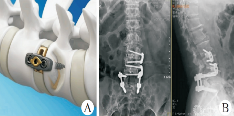 因此,侧方钢板的应用能部分解决这个问题[43]。斜外侧脊柱融合固定系统(PIVOX)(图7)是目前比较成熟的侧方固定方式,已在我科初步应用,用于腰椎节段性不稳定、腰椎椎管狭窄、腰椎侧弯、腰椎盘源性腰痛、邻椎病(图7)等腰椎疾病,截至目前随访结果满意。