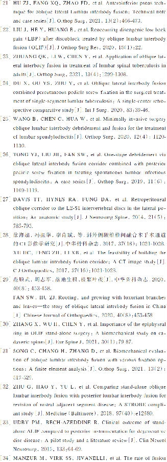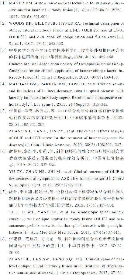 腰椎椎体间融合术因融合率高,因能有效重建腰椎生理曲度而被广泛应用于腰椎滑脱等脊柱失稳性疾病。经腹膜外侧斜前入路腰椎椎间融合术(oblique lumbar interbody fusion,OLIF)于1997年首次由MAYER[1]提出,受限于配套器械及融合器一直未能广泛开展,直至2012年,HYNES教授在原有经腰大肌入路椎间融合器的基础上改良并研发了OLIF专用的融合器及其配套的通道系统之后,OLIF技术才能广泛应用于临床。