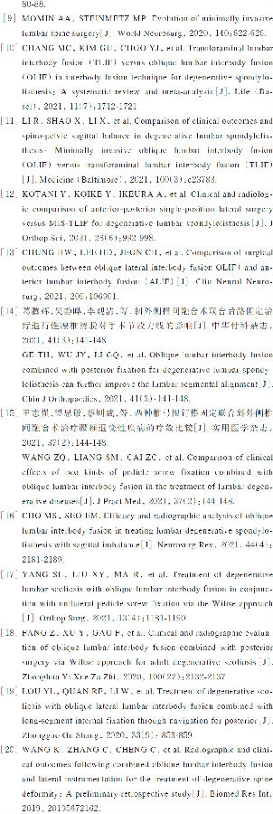 CHUNG等[13]的研究表明,相较于前入路腰椎椎间融合术(anterior lumbar interbody fusion,ALIF)手术,OLIF在恢复椎间隙高度及节段前凸方面更加具有优势;葛腾辉等[14]研究证实,OLIF联合后路固定治疗退行性腰椎滑脱能进一步减少腰椎退行性滑脱患者的滑移率,并增加手术节段前凸角度。