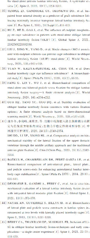 FANG等[39]通过构建有限元模型比较Stand-alone OLIF与OLIF联合后路钉棒系统固定两种手术方式后屈伸活动时终板应力等的变化,发现OLIF联合后路钉棒系统可降低屈伸活动时终板所承受的最大应力。术中终板损伤、间隙过度撑开等均会增大融合器沉降的发生风险。