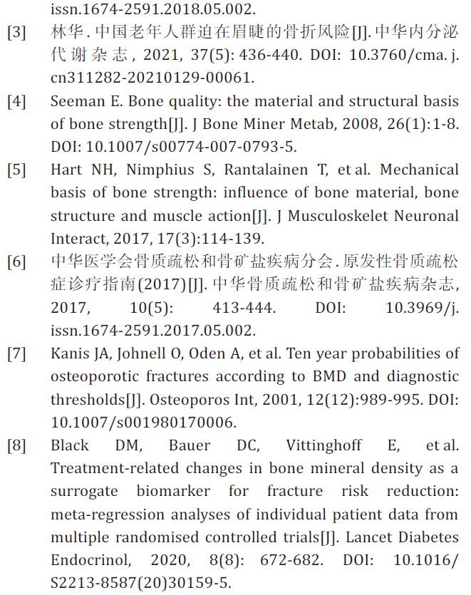 综上所述,骨质疏松性骨折是骨骼在骨质疏松病变的基础上发生的病理性骨折,主要表现为骨骼材料属性和组织结构等方面的损害。这些骨骼的病变,严重影响骨质疏松性骨折手术后的临床疗效。骨质疏松性骨折单纯的手术治疗无法阻止骨质疏松骨损害的进一步发展,重视并明确这些骨骼病变,术后积极的抗骨质疏松治疗,对确保骨质疏松性骨折的术后疗效和预防再骨折的发生至关重要。骨质疏松性骨折骨质量变化的评估与干预有待进一步深入研究。