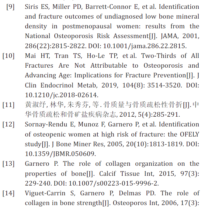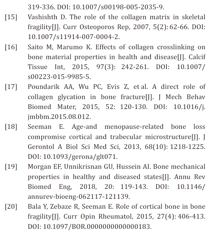 骨组织中无机物和有机物之间关系紧密,共同影响着骨骼强度。骨基质具有独特的矿化能力,与其他代谢性骨病不同,骨质疏松症的病理特征表现为骨基质材料属性中无机物和有机物的等比例变化。目前骨密度降低所导致的骨质疏松材料属性异常的相关研究较多,但以胶原蛋白为主的有机物病变所致的骨骼损害一直未被重视[5]。流行病学研究发现,有近一半的绝经后妇女发生脆性骨折时,骨密度降低并未达到骨质疏松的临床诊断标准[12],其重要原因在于骨量丢失(无机物减少)固然重要,而胶原病变(有机物减少)也是其重要原因,它是无关于骨密度变化,而直接与骨强度相关的独立因素[13]。