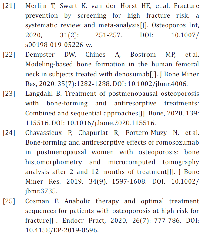 骨质疏松的防治的最终目的是骨折的预防,骨损害所致的骨折风险是抗骨质疏松治疗的重要依据[21]。目前抗骨质疏松药物主要包括抗骨吸收类药物和促骨形成类药物,通过不同的作用机制实现增加骨密度、改善骨微结构、提高骨质量的疗效。抗骨吸收类药物治疗是目前骨质疏松及其骨折常规治疗的主要选择,这类药物不影响骨折愈合,但也无法促进骨折愈合,对骨损害的治疗作用主要表现为提高骨量、改善骨质量。促骨形成类药物治疗在提高骨密度的同时,增加Ⅰ型胶原的合成,对骨质疏松性骨折骨损害有直接的治疗作用,对骨折愈合也有一定的促进作用[22-24]。骨质疏松性骨折患者属于极高骨折风险人群,近年来的学术观点认为,对于极高骨折风险人群,应首先选择促骨形成类药物治疗[25]。