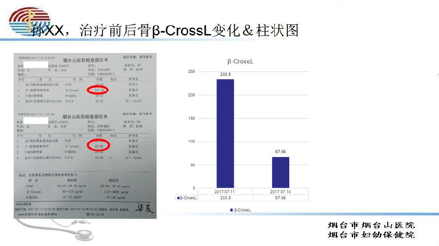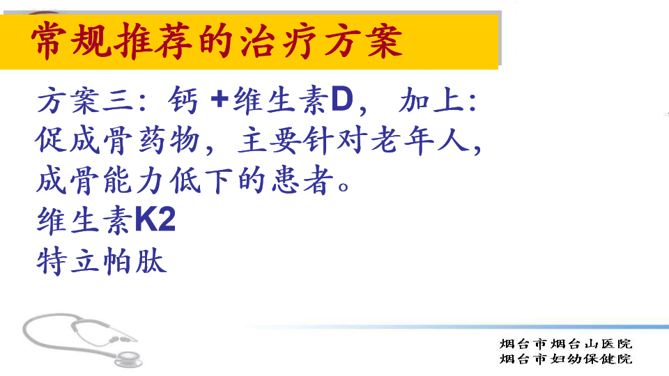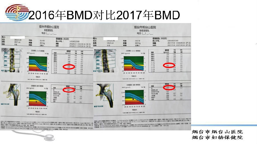 方案三,钙加维生素D,加特立帕肽等促成骨药物。主要针对严重骨质疏松症、多次骨折、骨密度较低的患者。治疗前需查骨密度和血清P1NP,治疗后3月、6月复查血清P1NP;治疗前后对比,治疗后P1NP预计明显升高。骨密度一般6月查一次,治疗前后对比,患者腰椎和髋部骨密度值预计有提高。用客观指标和患者交流,明显提高了患者的依从性。
