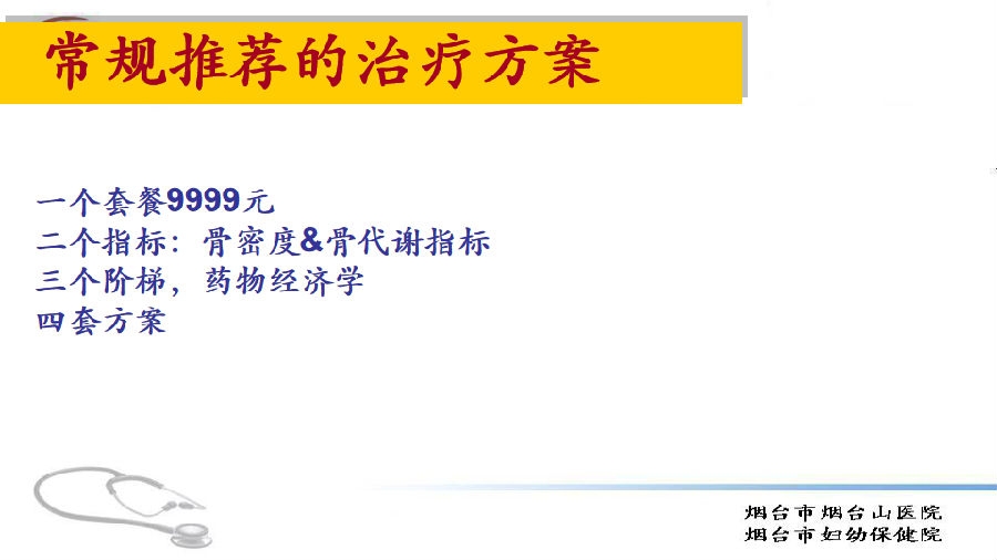 为便于掌握,我们总结出“一二三四”口诀:一个9999元套餐;二个抓手:骨密度和骨代谢指标;三个阶梯,按照药物经济学划定;四套骨质疏松症用药方案。