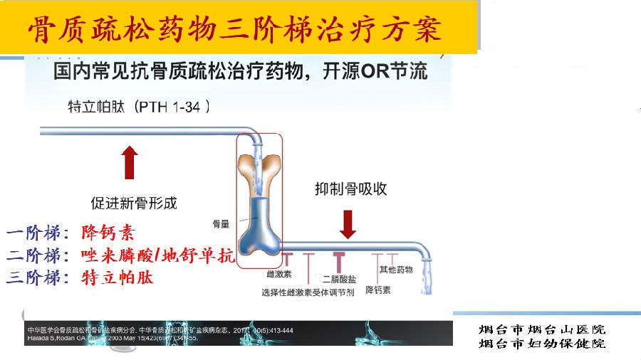 三个阶梯,是按照花费多少确定的阶梯。第一阶梯是降钙素,费用最少,大约1000元;第二阶梯是唑来膦酸,一般住院治疗,医保报销后个人花费3000元;第三阶梯是特立帕肽,花费较高,费用6个月大约2万元。为何提出三个阶梯?因为骨质疏松症患者多数为老年人,对疾病重视程度和经济条件差异大,医生必须结合患者经济情况制定用药方案。