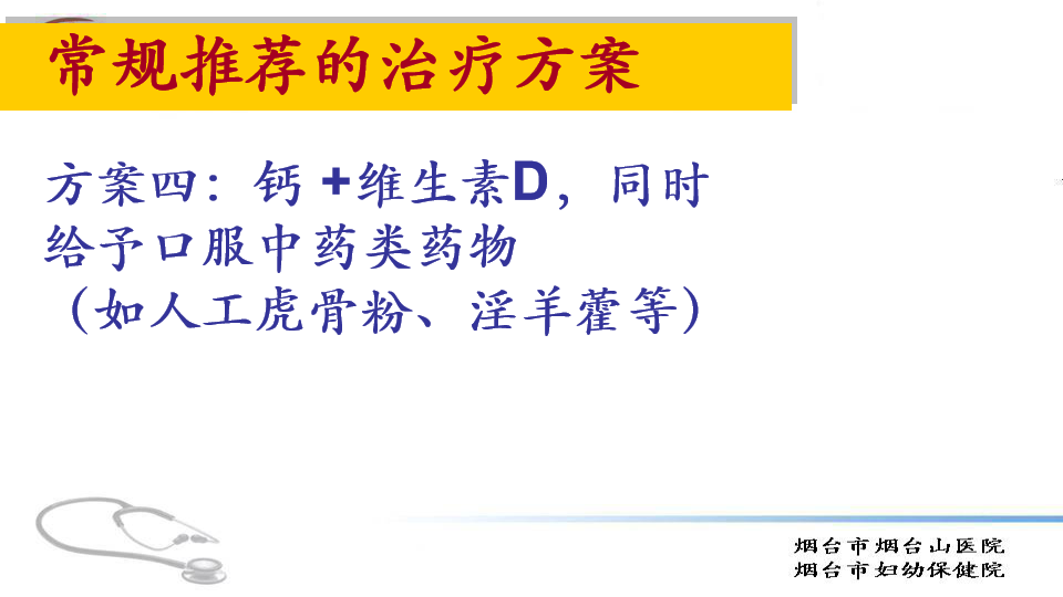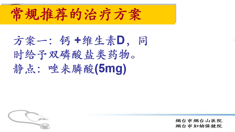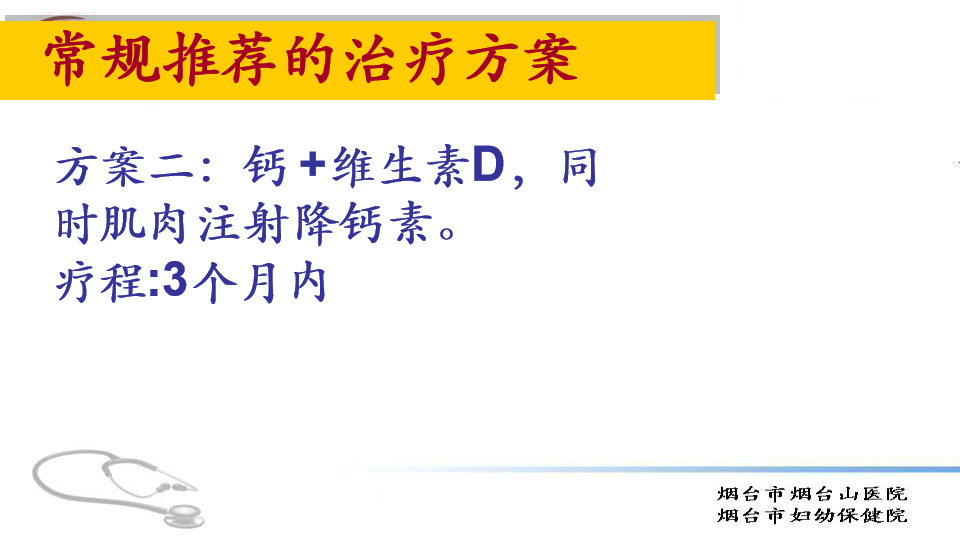 方案二,钙加维生素D,加降钙素,疗程在3个月内。这套方案是针对疼痛明显的患者,治疗效果明显,花费低。