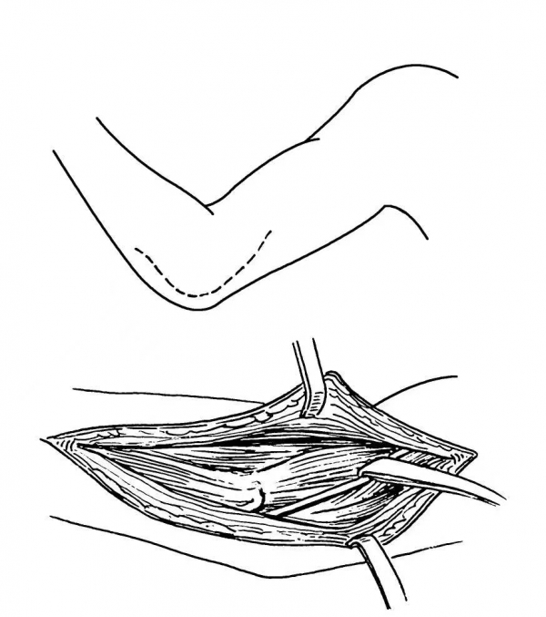 尺神经于肱动脉后方,在上臂中段转入肱三头肌内侧头筋膜内,伸延至肘关节后的尺神经沟,在虚线上切开,即可显露出尺神经。