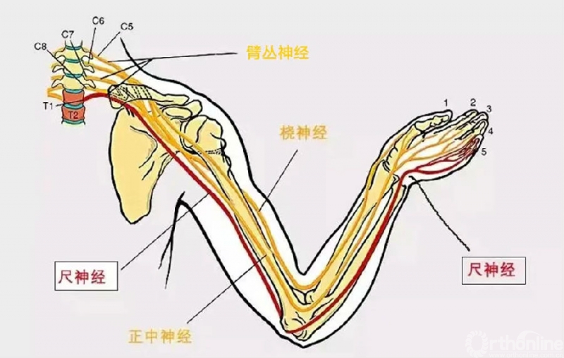 尺神经(ulnar nerve)主要由第8颈神经根和第1胸神经根合成下干后发出的前股单独形成的内侧束的神经纤维组成。