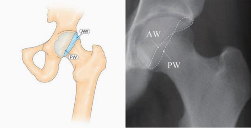 图1 髋臼交叉征阳性表现 AW(髋臼前臂边缘)和PW(髋臼后壁边缘)的投影成“8”字交叉