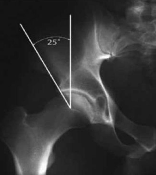 (2)LCE角:又称为外侧中心边缘角,反映髋臼外侧对股骨头的覆盖情况,是指在骨盆正位片上,通过股骨头中心的垂直线和股骨头中心与髋臼外上缘连线的夹角。其正常值标准尚无定论,一般认为是25°~35°,当>40°时考虑髋臼存在过度覆盖(图2)。