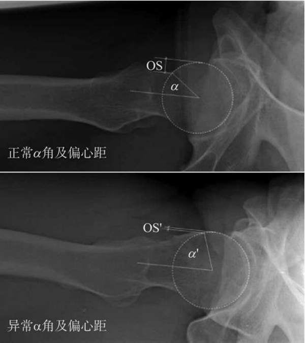 图3 α角及偏心距(OS)测量 A.正常股骨头颈;B.股骨头颈凸轮型畸形