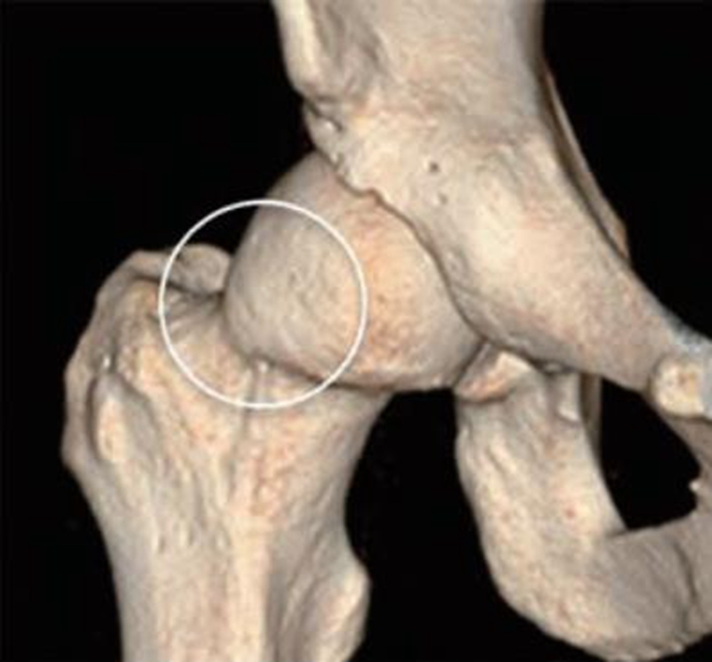 图5 髋关节三维CT影像 显示股骨颈前外方,明显骨性突起