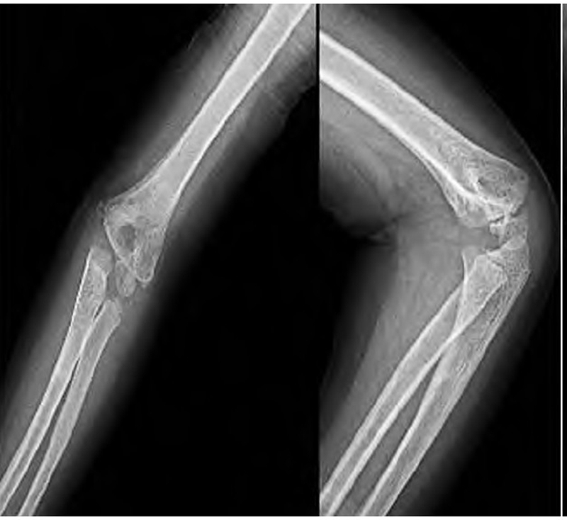 入院诊断:左侧开放性肱骨髁上骨折,左孟氏骨折,左尺桡骨远端骨折,左上臂桡神经损伤,左肘关节异物。