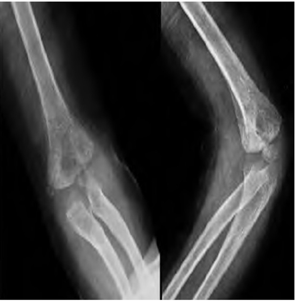 图3 术后7周 DR片示内固定已完整取出,肘关节位置良好