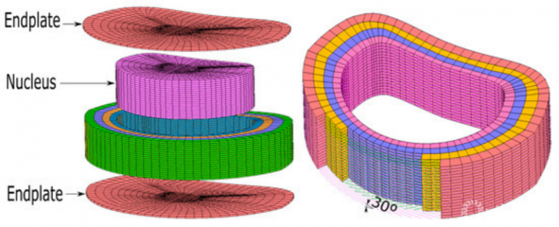 有限元模型用于研究椎间盘退变和生物力学特征改变之间的关系,退变的模型是通过改变组织的材料和几何形状,进而显示椎间盘在负载下的某些特征和属性的改变。