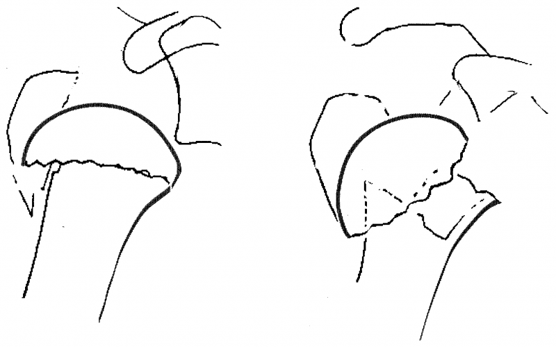 图4 第三条额外标准:头劈裂。左侧为典型头劈裂骨折的形态。右侧为特殊类型头劈裂骨折,该类型中两个骨折块的血运都得以保留。