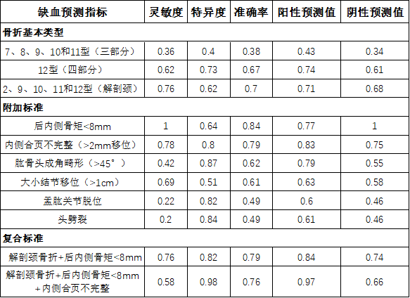 总而言之,预测肱骨头缺血的最重要指标是后内侧骨矩的长度、内侧合页的完整性以及二分类描述体系下的某些特殊骨折类型(表1和图6)。