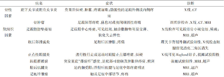 大多数情况下,临床症状足以诊断跖筋膜炎,然而,对于疼痛>3个月且治疗无效的患者,影像学有助于鉴别是否存在其他诊断。X线检查有助于评估骨性病变,如跟骨应力性骨折和后足退行性关节病等,足跟侧位片可能会有50%的概率发现跟骨骨赘,然而,跟骨骨赘是否直接导致跖筋膜炎目前仍不清楚,但有许多文献表明两者之间存在联系。MRI能详细显示足底筋膜的解剖结构及软组织内的水肿,对于发现跖筋膜断裂、确诊跖筋膜炎较为敏感。超声被认为用于诊断跖筋膜炎与MRI可靠性相当,且更为廉价,它通过确定跖筋膜的厚度和撕裂的位置来辅助诊断,根据已公布的标准值,成人跖筋膜厚度在(3.3±0.3)mm 至(3.9±0.5)mm之间,而跖筋膜炎患者的超声检查厚度往往大于4.0mm。血液检测并不是决定性的,因为炎症标志物会伴随全身性炎症而升高,并不会因局部(机械性微撕裂)引发的刺激而变化,然而在较年轻的双侧足跟痛患者中(约30%),必须考虑全身性关节病,如类风湿关节炎、强直性脊柱炎、银屑病性关节炎等,常需要进一步血液检测,如白细胞计数、HLA-B27、抗核抗体和尿酸等。足底外侧神经从胫神经分出后,大约在踝管末端的下方分出第一神经支(Baxter神经),较深的Baxter神经从载距突后侧垂直向下,并在展肌深腱膜和跖方肌内侧缘水平跨过直至小趾展肌,此段最易发生卡压,疼痛多位于跟骨内侧缘赤白肉际处,可沿神经末梢向足底放射痛。另一潜在受压点是Bax-ter神经穿过跟骨内侧结节时,跟骨骨赘与跖筋膜炎都可使神经受到压迫并卡压于跖长韧带,此时Baxter神经卡压症常与跖筋膜炎并存,从解剖学角度认为Baxter神经卡压是跖筋膜炎病理产物的作用对象之一,临床表现均为足底内侧疼痛,甚至有学者报道约20%的足跟痛患者是由Baxter神经卡压造成的,MRI与肌电图可协助诊断。如果病史和体格检查发现跖筋膜炎不典型,则应寻找足跟疼痛的其他原因(表1、图1)。