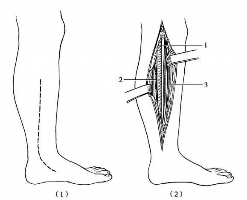 图3 探查小腿中、下段胫神经(1)切口;(2)1.胫神经在2.比目鱼肌和3.趾长屈肌之间下行
