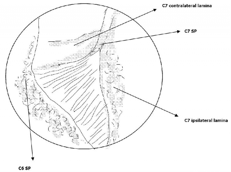 颈椎ULBD单侧入路双侧减压减压的难点还是在于识别棘突与椎板的移行部位及对侧结构的显露。