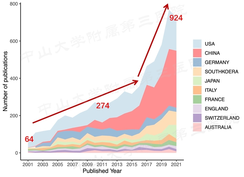 通过下图展示了近20年来发表的关于微创脊柱的论文数量的趋势图。可见论文数量逐年增加,2016年前平稳增长,2016年到2021年近5年增长迅速。