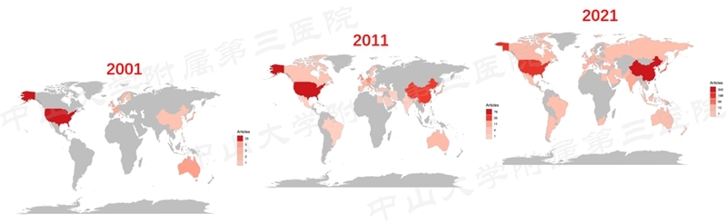 通过地图可以更为直观的看到近20年发表论文的国家分布演变的趋势。2001年也就是20年前,美国起步较早,大多数论文均来自于美国学者;10年前,东亚、西欧、北美等地区的研究也逐渐增多,但仍然是美国居首;2021年微创脊柱外科的研究已经遍地开花,多个国家和地区都进行了相关研究,且研究数量中国已经迎头赶上,位居首位。