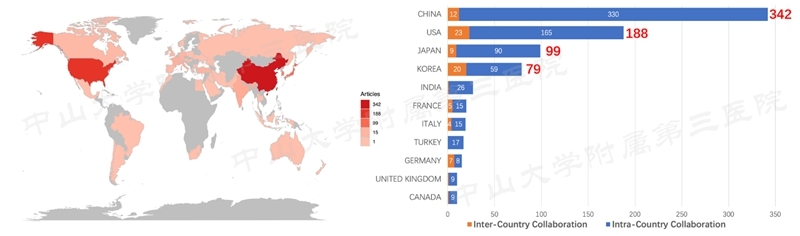 2021年中国发文量最大,发表论文342篇,占37.0%;美国次之,日本及韩国紧随其后。但中国论文仅有3.5%是跨国合作,而美国则有12%,最高是德国的46.7%。