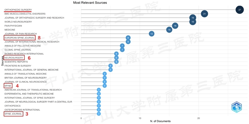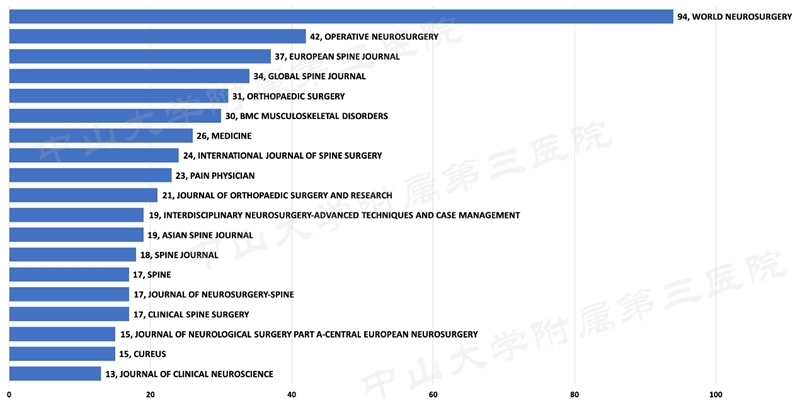发表最多的杂志为WORLD NEUROSURGERY,2-5位依次为OPERATIVE NEUROSURGERY,EUROPEAN SPINE JOURNAL,GLOBAL SPINE JOURNAL,ORTHOPAEDIC SURGERY。