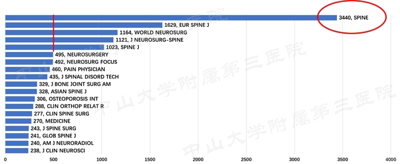 发表的论文参考文献里,引用最多的杂志如下图所示,其中SPINE作为脊柱外科最顶尖的杂志被引用是最多。