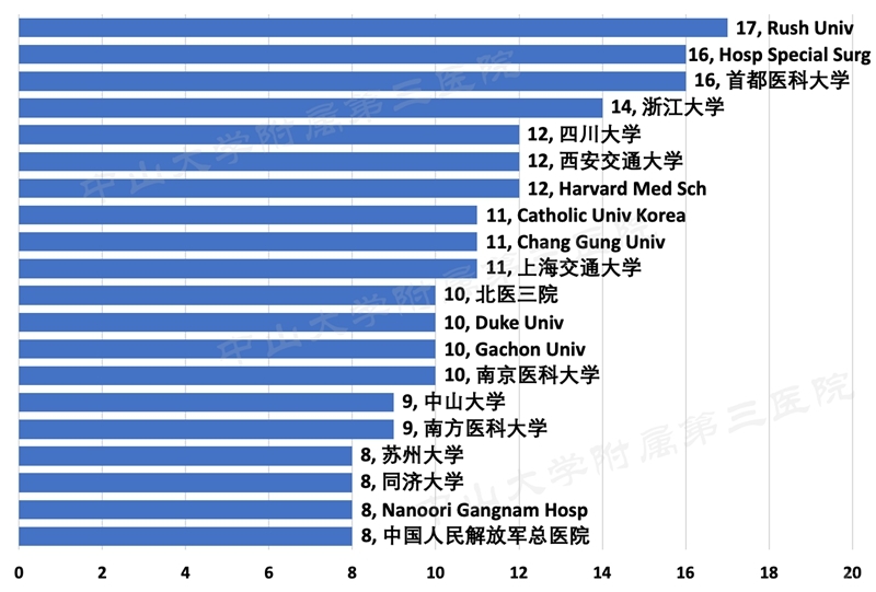 发表论文的国家前三位为美国拉什大学、特种外科医院及中国首都医科大学,前20位中12家为中国机构,美国4家,韩国3家。