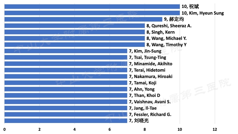 下表显示的是在发表的论文当中,被引用次数较多的论文,其中引用最多的被引用了10次,高被引论文以侧方融合为主为主,还包括骨水泥强化手术,其中还有4篇关于VR、导航、机器人等新辅助技术。