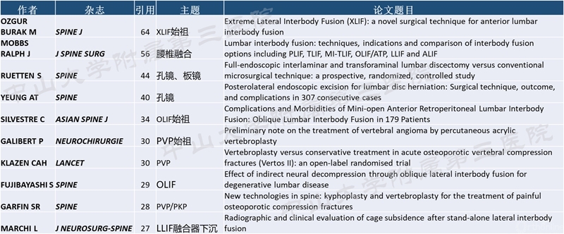 下表显示的是发表论文里最常引用的参考文献,主题是以脊柱融合手术,脊椎内镜手术,骨松骨折及骨水泥强化为主。