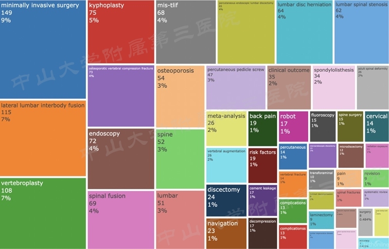 下图为发表论文关键词的Treemap图,显示了各关键词的比例,从中可以看出哪些疾病、哪种手术方式研究得比较热门。居于首位的关键词是PVP。