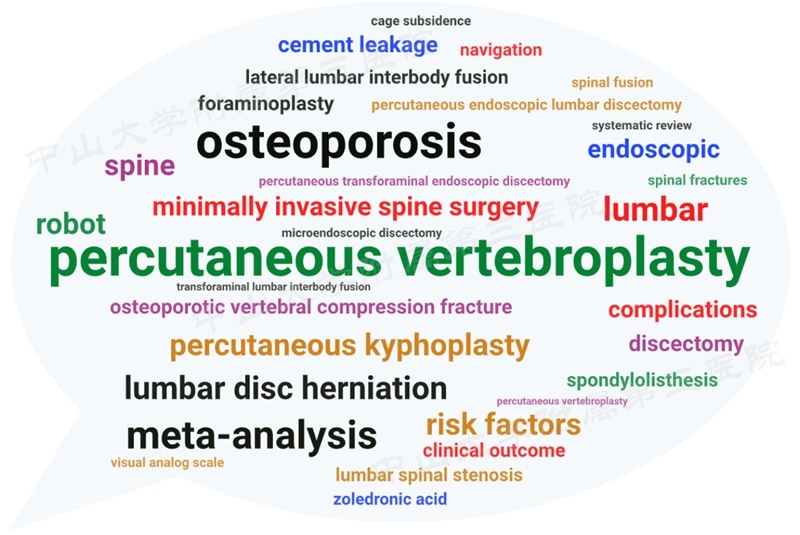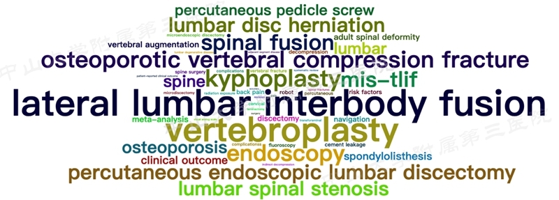 关键词云图对热点看得更为清晰,研究最为热门的疾病为骨质疏松椎体骨折,其次为腰椎间盘突出症,腰椎管狭窄症及腰椎滑脱症,研究还是以退行性疾病为主,肿瘤、感染、畸形的疾病在微创领域研究较少。重点研究的部位为腰椎。
