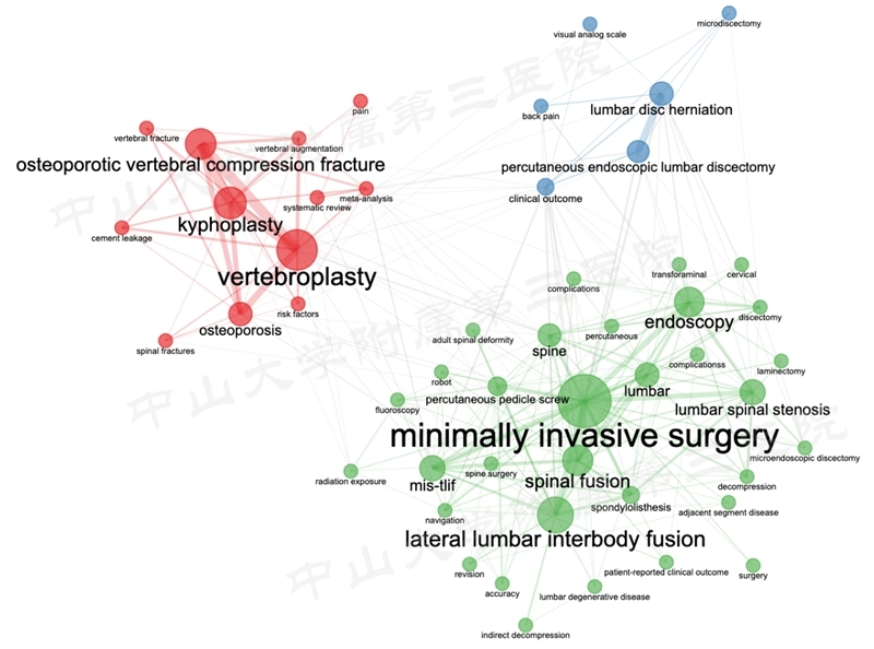 通过对关键词聚类,可以看到,骨质疏松的研究集中在椎体压缩性骨折,手术治疗为PVP与PKP,较多论文是属于meta分析,方向主要在危险因素分析及骨水泥渗漏方面;而腰椎间盘突出症的研究集中在脊柱内镜上,常常研究其临床疗效;腰椎滑脱、椎管狭窄的研究则主要为椎间融合手术,包括MIS-TLIF与LLIF,也是主要研究其临床疗效,还有部分关于机器人与导航的应用。