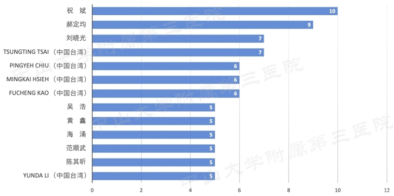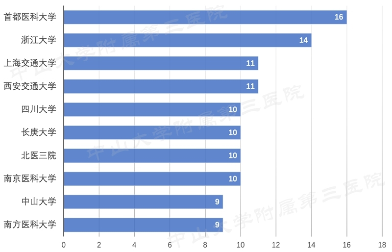 发表论文的最多的机构为首都医科大学,浙江大学次之,上海交通大学、西安交通大学、四川大学、北医三院、南京医科大学、中山大学及南方医科大学位居前十,中国台湾的长庚大学也在其中。
