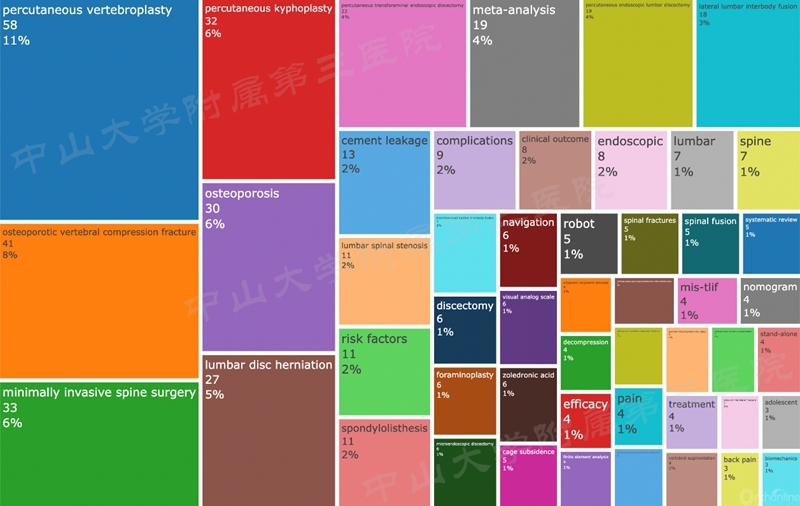 云图对关键词的热点看得更为清晰,其中国人研究最为热门的疾病为骨质疏松椎体骨折,其次为腰椎间盘突出症,腰椎管狭窄症及腰椎滑脱症,研究还是以退行性疾病为主,肿瘤、感染、畸形的疾病在微创领域研究较少。