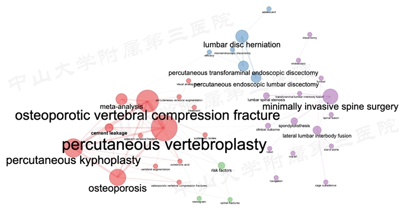 通过对关键词聚类,可以看到,椎管狭窄、腰椎滑脱的研究则主要为微创椎间融合手术,包括LLIF和MIS-TLIF,研究包括减压效果,邻椎病,还有部分关于机器人与导航的应用。骨质疏松的研究集中在椎体压缩性骨折,手术治疗为PVP与PKP,较多论文是属于meta分析,方向主要在危险因素分析及骨水泥渗漏方面。而腰椎间盘突出症的研究集中在脊柱内镜上,常常研究其临床疗效。
