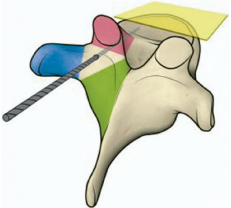 图1 图示为胸椎。红色是上关节突,蓝色是横突,绿色是峡部。获得Springer Link Publishing授权使用(图片经Perna允许后重绘)。