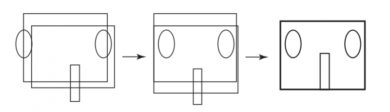 图2 使用术中X线透视可帮助确认合适的入钉点。该示意图表示透视的形状。椭圆形为椎弓根,矩形为椎体。当椎体在不同平面均重叠时,椎弓根将位于矩形的上角,且变得更加清晰。当图像中终板重叠时其密度将升高,棘突应位于椎体的中央。通过单纯移动C形臂就可轻易获得优质的图像。(例如将棘突置于椎体的中央,然后将终板调整至重叠)。