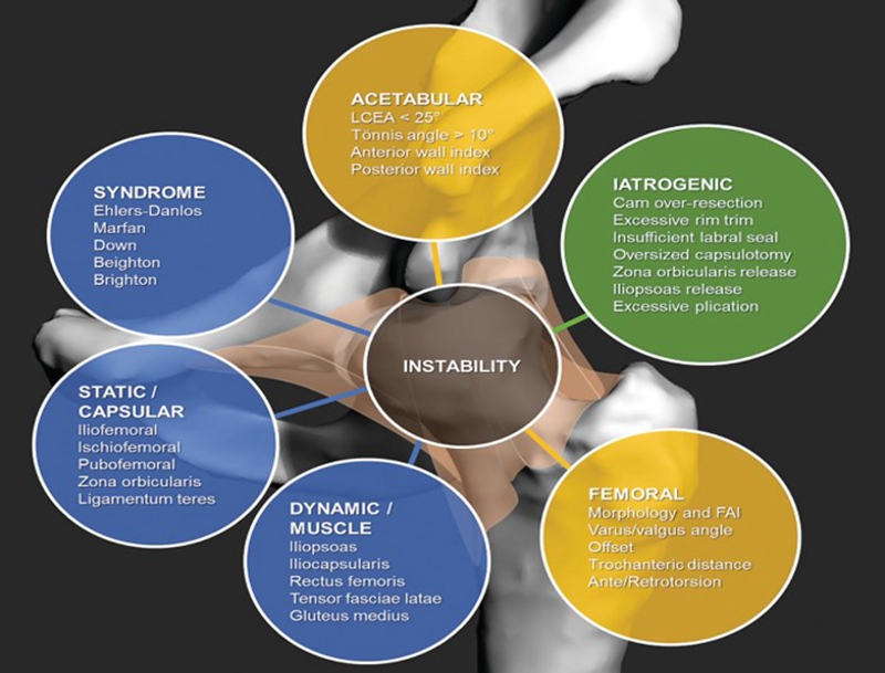 髋关节不稳涉及的病因为多方面,包括系统性问题、骨性覆盖问题、静态结构或动态结构的问题。还有一类为医源性不稳。