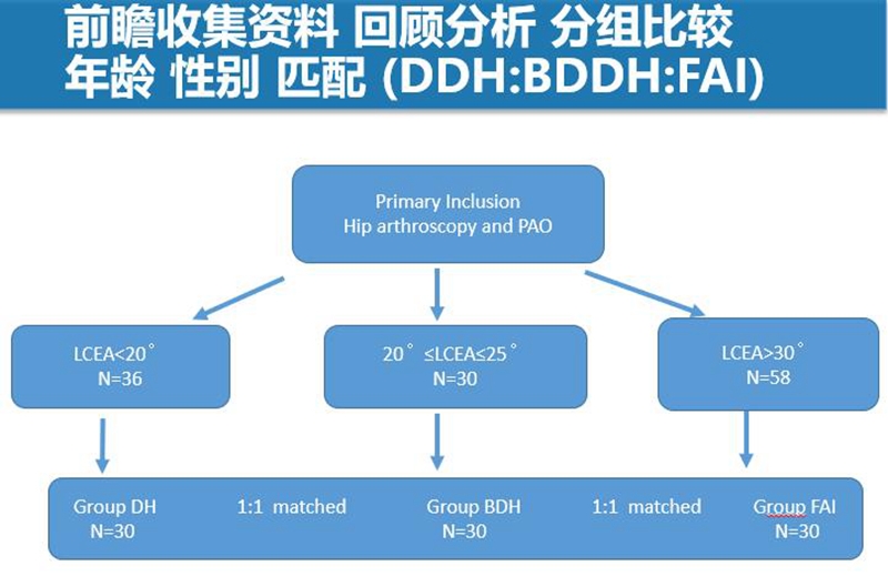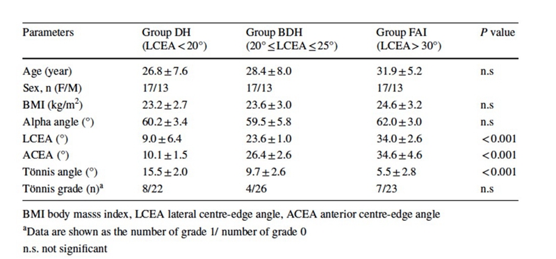 为此,笔者团队对临床资料进行了前瞻性收集,通过收集DD H、BDDH、FAI三组病人,然后进行了一个回顾性分析。在DDH组,LCEA角的纳入标准是<20°,BDDH组是20°~25°,FAI组做了特殊处理,就只选择LCEA角>30°的病人。也就是说这三组病人一种是明显的不稳定,一种是明显的稳定,中间组介于两者之间。