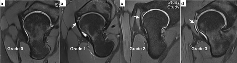 除厚度测量之外,也借助半月板的信号分级对前关节囊进行了内部信号分级。临床分为0~4级,正常表现是0级,出现点状信号为1级,出现线状信号为2级,出现断裂或者明显的贯通样分层为3级。