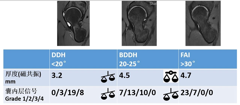 通过对于关节囊厚度和关节囊信号的测量,是否存在一个能够帮我们区分哪些患者倾向于稳定,哪些患者倾向于不稳定这样的一个截断值?我们通过一个病例设定截断值大概在4mm,通过观察发现,在<4mm的病例主要集中在DDH,而基本上所有BDDH和FAI病人的关节囊厚度都是>4mm的。所以我们提出一个预先的、简洁的记忆标准,即4mm可能作为判断关节囊是否比较薄,启示关节囊不稳定的一个数值。