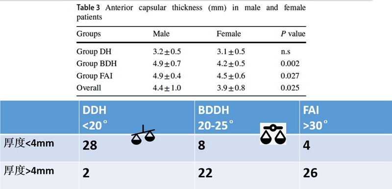 同时,也通过关节镜下进行了评估和测量。采用关节囊纵切的方式,就有机会测量到关节囊中段的厚度。通过镜下测量发现,BDDH组和FAI组的中位值分别是6mm和7mm。