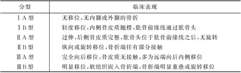 肱骨髁上骨折的标准分型,是将其分为伸直型和屈曲型。屈曲型少见,侧位X线片示骨折远端位于肱骨干前方。伸直型常见,Gartland将其分为Ⅰ~Ⅲ型(表1)。
