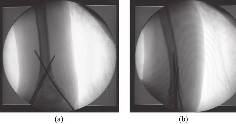 骨折闭合复位后克氏针固定的方式和最佳的数目也存在不同观点。编者的经验是克氏针固定时应彼此呈分岔状,在骨折平面彼此间隔越远越稳定,克氏针不应在骨折平面交叉,否则不能控制旋转且固定不牢靠。采用内侧克氏针固定时应注意避免损伤尺神经。不要在肘关节屈曲位置时穿针,需稍伸直肘关节以使尺神经后移,用拇指触及尺神经并将其推向后方后安全穿克氏针。应用交叉克氏针内固定对于术后功能康复、骨折愈合率、骨折愈合优良率等具有潜在的优势,这有利于术后早期康复。