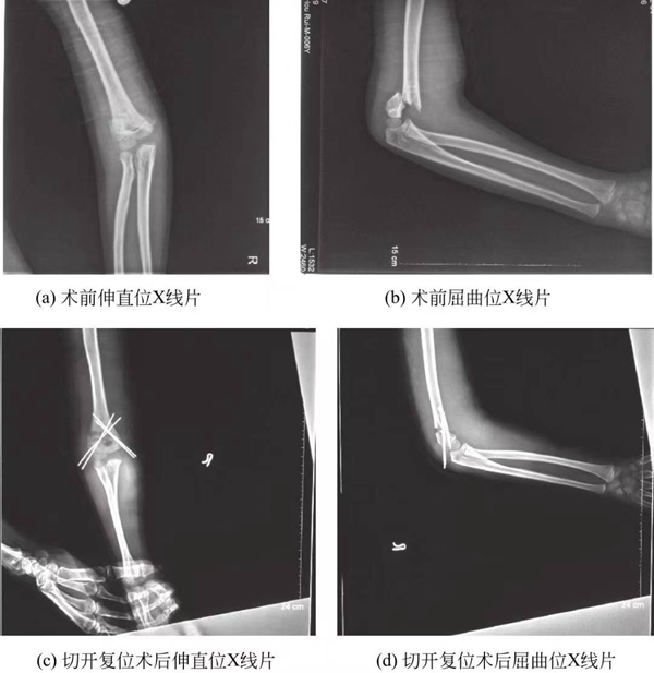 (3)Ⅲ型肱骨髁上骨折:所有的Ⅲ型肱骨髁上骨折复位经皮克氏针内固定是目前Ⅲ型髁上骨折的标准治疗方法。通常可闭合复位经皮克氏针内固定,但若软组织嵌入不能解剖复位或存在肱动脉损伤者需切开复位(图2)。